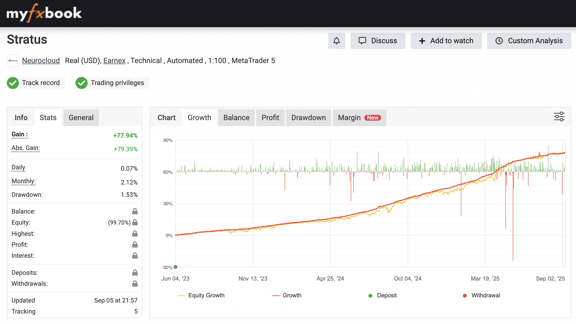 We’re proud to hold ourselves to the highest industry standards. All performance is verified through third-party tools like MyFXBook, and further validated by Alpha Performance Verification Services (APVS) - an auditing firm trusted by major brokers worldwide. Neurocloud does not hold client funds and does not offer brokerage services.