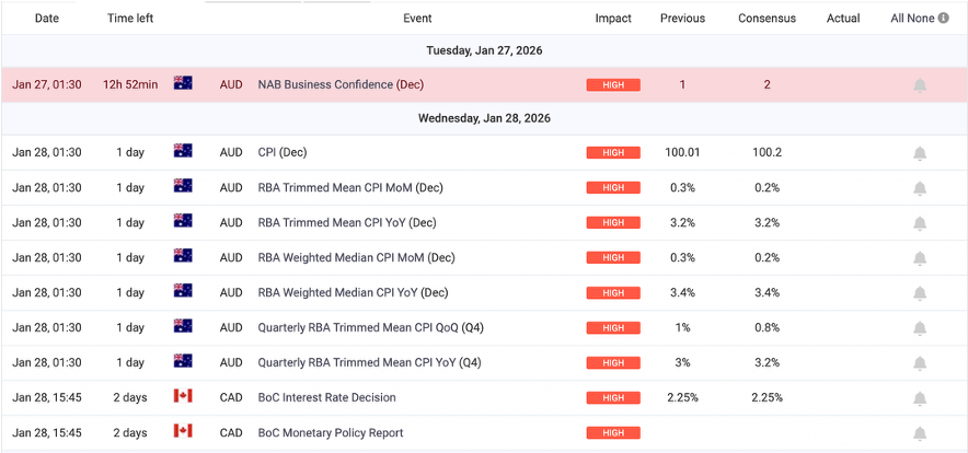 - RBA rhetoric softens / data cools: With some inflation lift driven by volatile components, a cautious RBA tone after late-January data could see AUD give back recent gains. In speculation-driven markets, pre-event repricings often mean-revert on the actual release.
